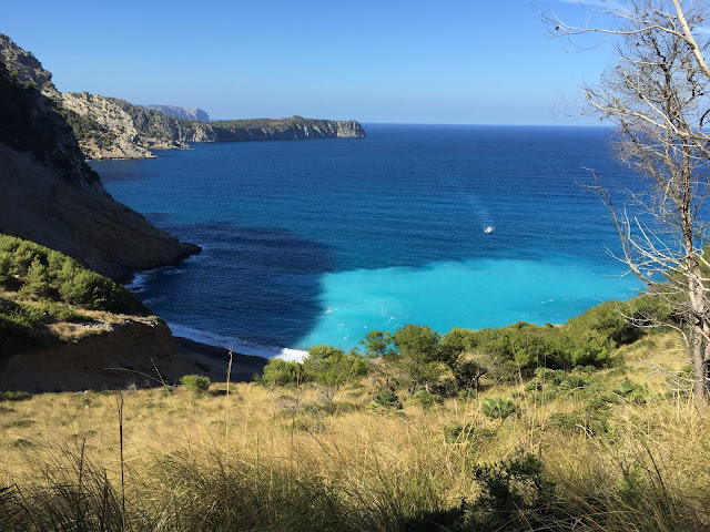 Abaix, la platja del Coll Baix. Més enllà, el Cap Pinar i, al darrere, el Cap Formentor